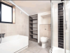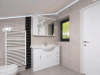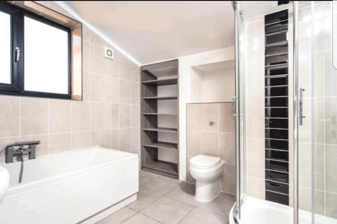 The bathroom is fully tiled with a modern combination of wall and floor tiles and consists of a bath tub, 900mm shower cubicle, back to wall toilet, vanity unit with mirror and shaver point , extractor fan, and a white modern looking tower rail. It also contains modern bathroom shelves for that extra storage space.