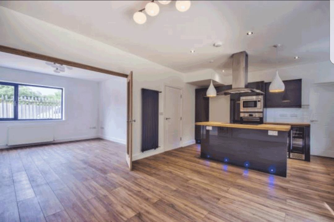 The fitted units consist of both wall and underwork top units, two larder units providing plenty of convenient storage. In the middle of the kitchen is a fashionable fitted curved island consisting of 3 drawers, blue plinth lights, USB sockets and hanging white shades on either sides of the kitchen hood that makes the whole kitchen look fabulous and modern.