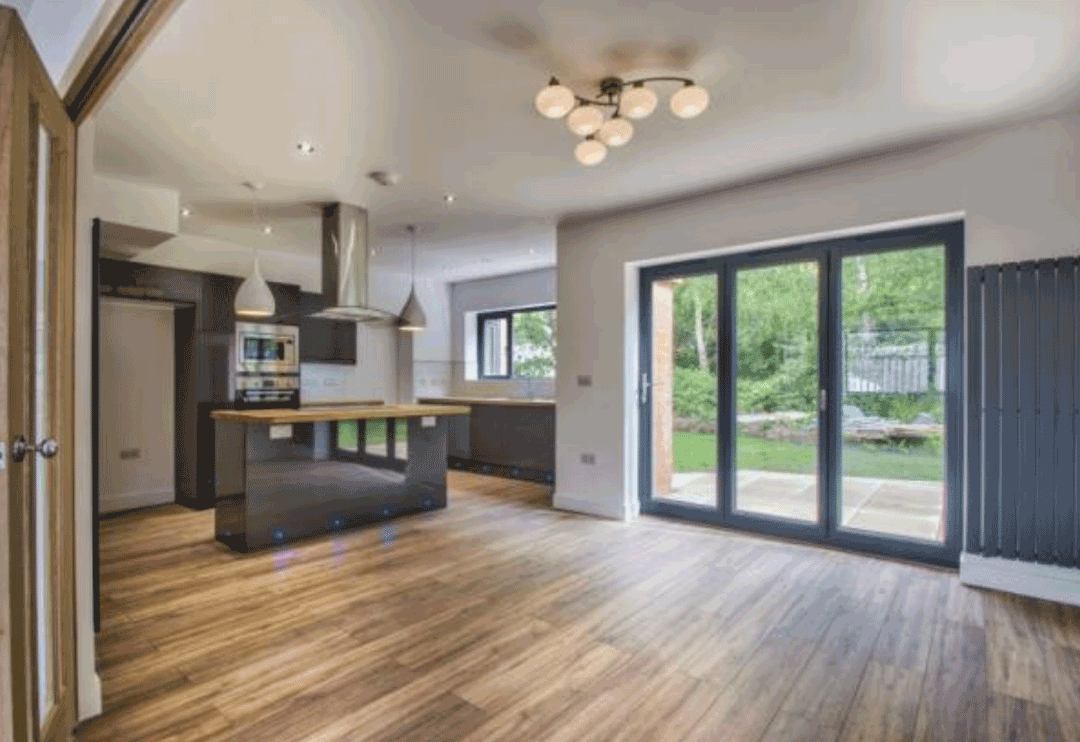The dining room consists of a large anthracite grey aluminium bi-fold door to the patio, anthracite grey radiator to match the bi-fold door, laminate floor, modern looking dimmable ceiling light, plus more electric sockets all around the room for that modern way of living.