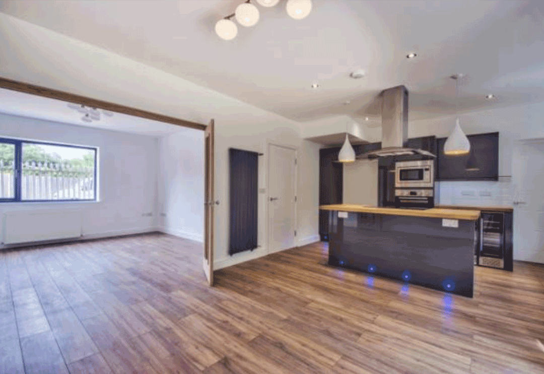 The fitted units consist of both wall and underwork top units, two larder units providing plenty of convenient storage. In the middle of the kitchen is a fashionable fitted curved island consisting of 3 drawers, blue plinth lights, USB sockets and hanging white shades on either sides of the kitchen hood that makes the whole kitchen look fabulous and modern.